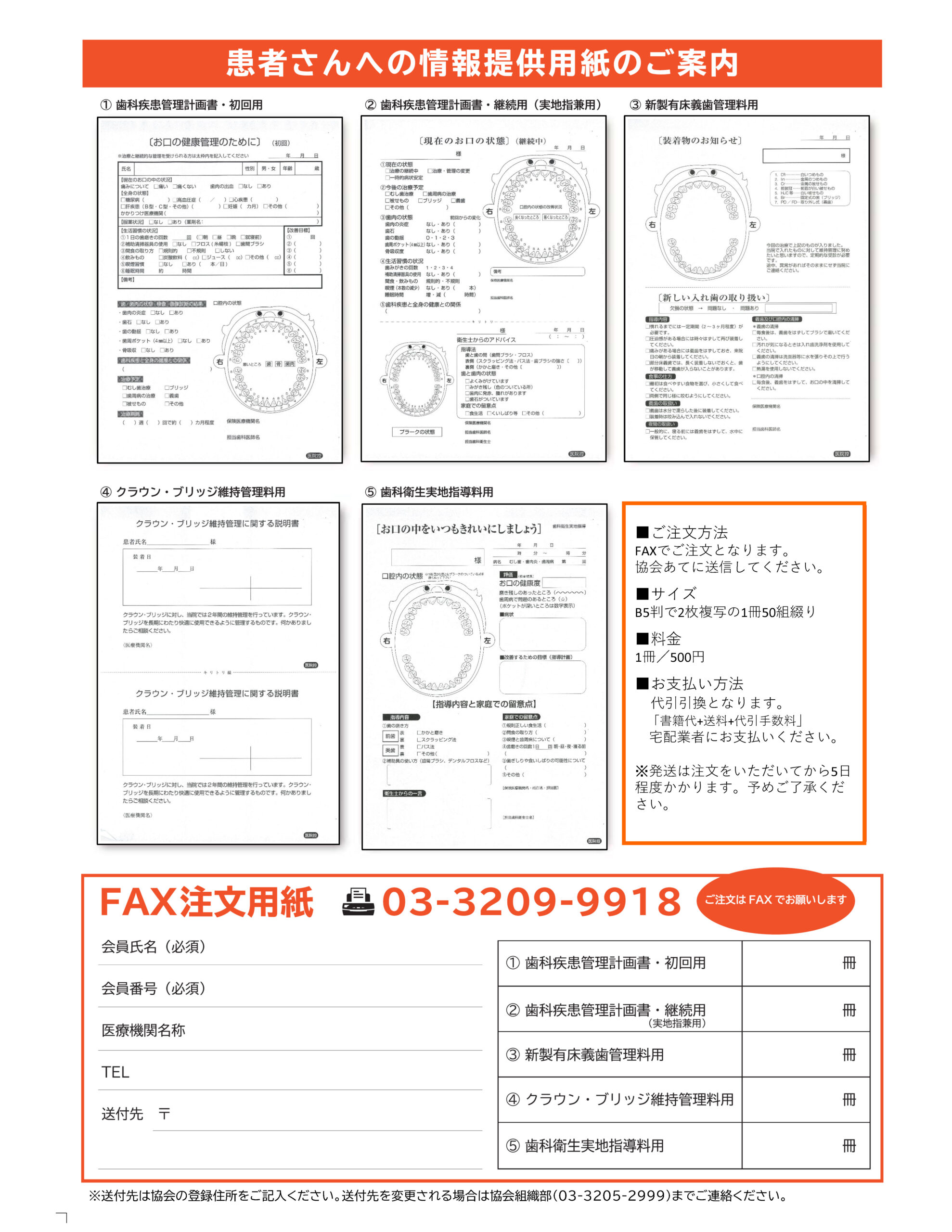 歯科疾患管理料(初回・継続)や歯科衛生実地指導料、クラウン・ブリッジ維持管理料、新製有床義歯管理料など患者にお渡しする文書をご用意しています。記載しやすい複写式となっています。