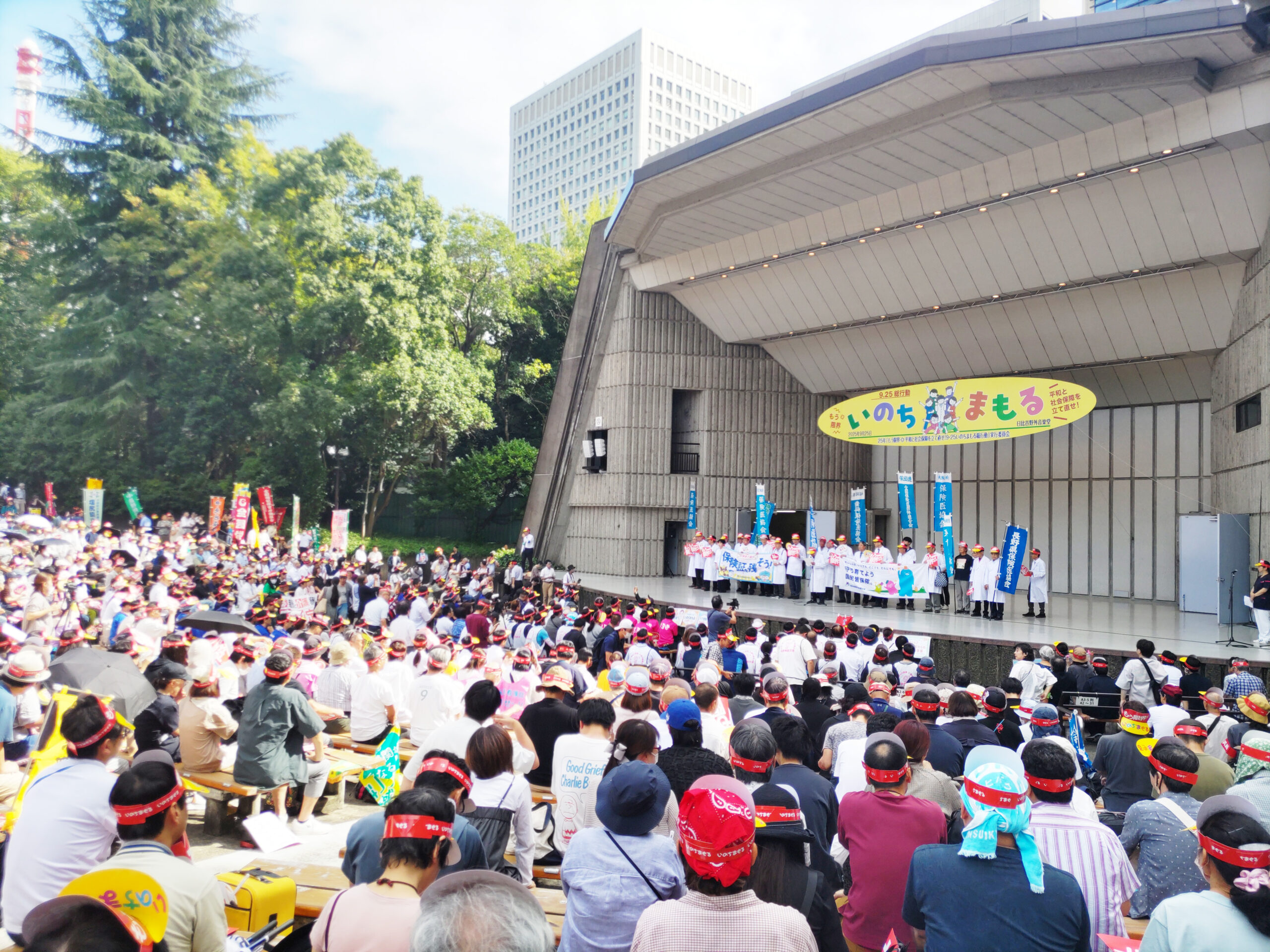9月25日に「いのちまもる9.25総行動」が開催され、医療従事者ら2,200名が日比谷野外音楽堂に集った。開会の挨拶に立った日本医療労働組合連合会の佐々木悦子委員長は、「物価高を背景に、医療機関の倒産が過去最高となっている。また、物価高に賃金が追いついておらず、医療機関などでの人員不足が慢性化している」と訴え、集会を契機に、診療報酬の大幅引き上げなど、各課題解決への取り組みの必要性を訴えた。