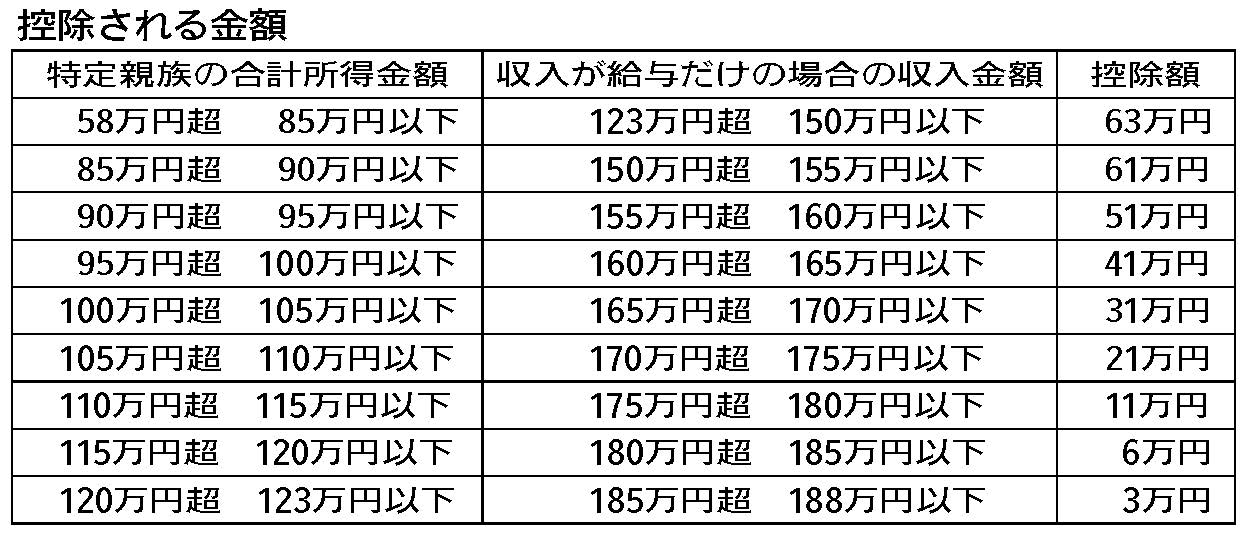 居住者が19歳以上23歳未満の一定の親族等(特定親族)を有する場合には、その親族等の合計所得金額に応じて最大63万円が控除されることとなりました。子等の合計所得金額が85万円(給与収入が150万円)以下の場合は63万円の所得控除が適用され、それを超える場合は控除額が段階的に逓減する仕組みです。