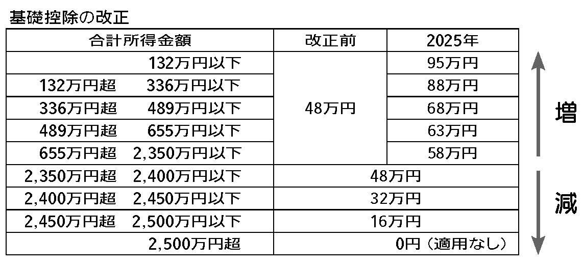 基礎控除が改正され、合計所得金額が2,350万円以下である場合の控除額が合計所得金額に応じて下記の通り変更となりました。改正前から10万円引き上げられ58万円となり、所得金額が下がれば基礎控除額が逓増し、所得金額が上がれば基礎控除額が逓減します。