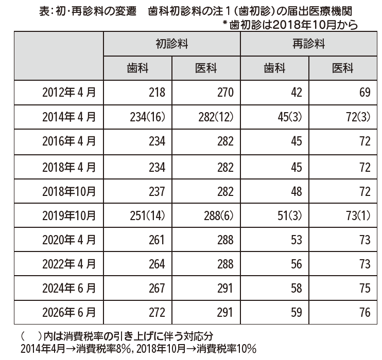 今次改定は、臨床現場の不合理の多くが是正された改定であると私は評価しています。しかし、歯周病安定期治療(SPT)と歯周病重症化予防治療(P重防)が整理・統合されて歯周病継続支援治療になること、有床義歯で義管と歯リハ1との同日算定、歯科衛生士ならびに歯科技工士への評価、ベースアップ評価料の変更など、保険診療を行う上で、理解が必要な変更点が多くあります。今回、初診料と再診料の点数アップと歯科初診料注1の施設基準(以下、「歯初診」)の研修要件の追加について解説します。今次改定において、初診料と再診料は、「歯初診」の届出を行っていれば改定前の初診料267点が、6月の改定後には5点増点の272点に、再診料58点が1点増点の59点なります。「歯初診」が未届の場合、改定前の初診料240点が、6月からは5点増点の245点に、再診料44点が1点増点の45点になります。これら初・再診料の点数引き上げの理由は、物価高騰による医療機関の物件費増加への対応とされています。表に12年からの歯科(「歯初診」届出医療機関)と医科の初・再診料の変遷を示します。歯科と医科の基本診療料の差は、12年時は初診料52点の差だったのが今次改定で19点、再診料27点の差が今次改定で17点と少しずつですが、縮まっているのが分かります。